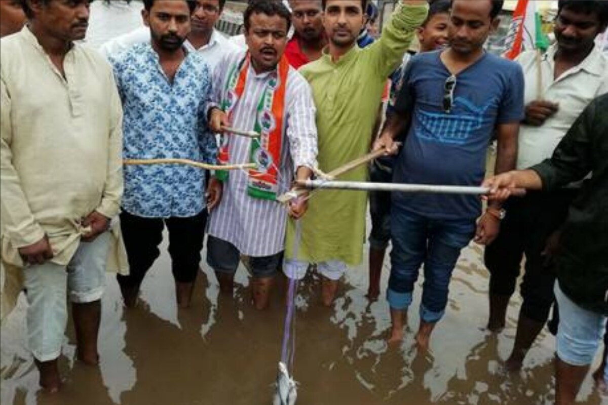 Congress workers reached Betiahata area of the city with fishing nets and began catching fishes from the knee-deep water on the street.